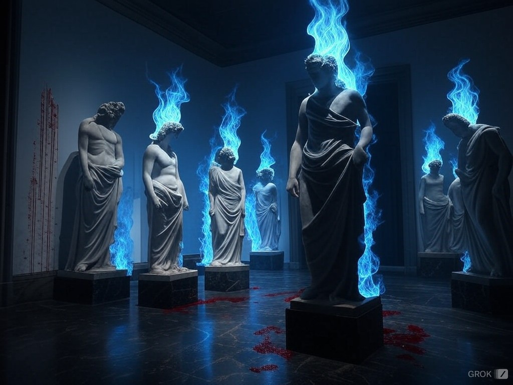 갑자기 갤러리의 불이 꺼졌다. 어둠 속에서 조각상들이 푸른빛을 내뿜기 시작했다. 자세히 보니 그것은 조각상이 아니었다. 실제 시신들이었다.