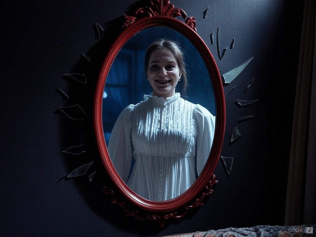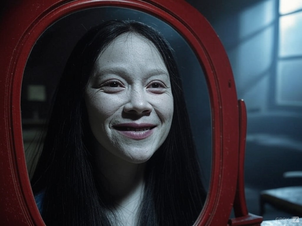 다음 날 아침, 이웃집 아주머니가 경찰에 신고했다. 붉은 액자의 거울 앞에 흰 원피스를 입은 젊은 여자가 쓰러져 있었고, 얼굴에는 기괴한 미소가 굳어있었다고 한다.